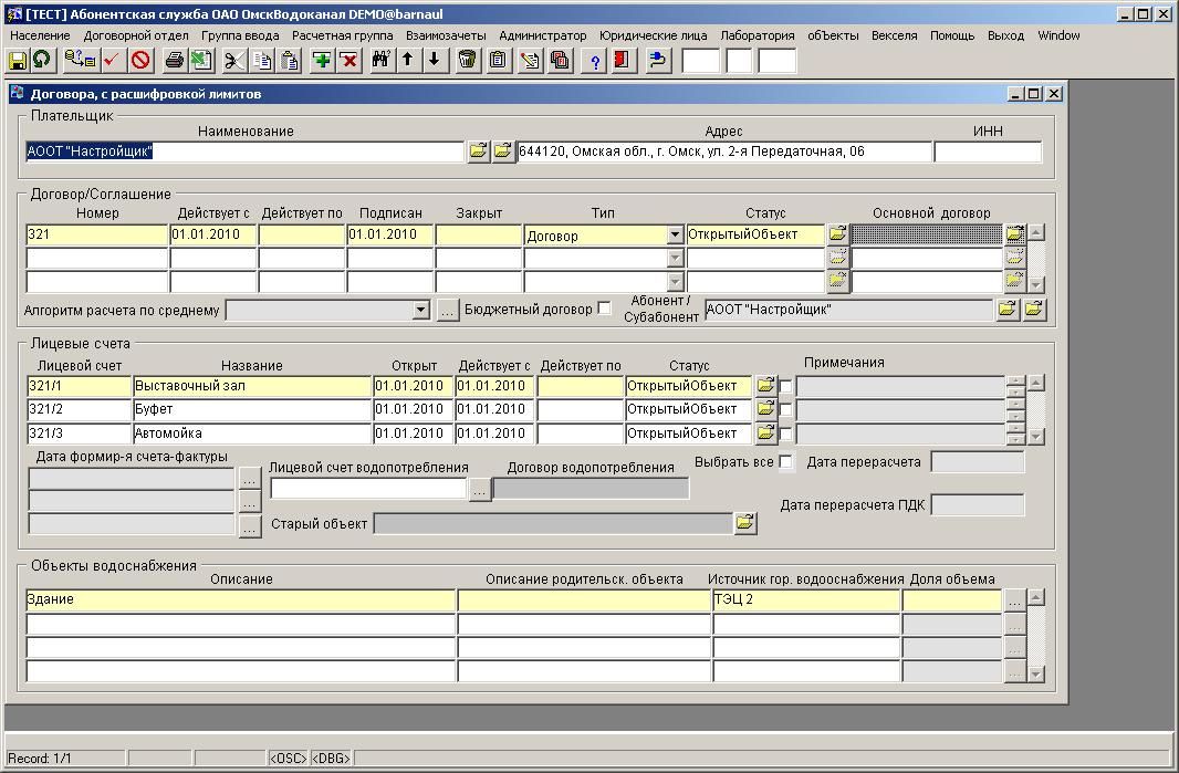 Глава 5. ДоговорДля расчета начислений по объекту водоснабжения необходимо внести договор. В системе учитываются плательщик, юридический адрес плательщика (и другие реквизиты), дата подписания договора, дата возникновения отношений, признак "бюджетный договор", лицевые счета по договору, абонент. Плательщик и абонент могут быть разными юридическими лицами. Начисления по договору (лицевому счету) и формирование счетов-фактур могут выполняться автоматически. Для задания даты расчета и формирования счетов-фактур предназначено поле Дата формирования счета-фактуры. Возможно автоматически проводить расчет и выставлять счета-фактуры три раза за учетный период по одному договору, например, десятого, двадцатого и тридцатого числа каждого месяца. Имеется возможность расчета водопотребления и водоотведения в разных договорах по одному и тому же объекту водоснабжения.