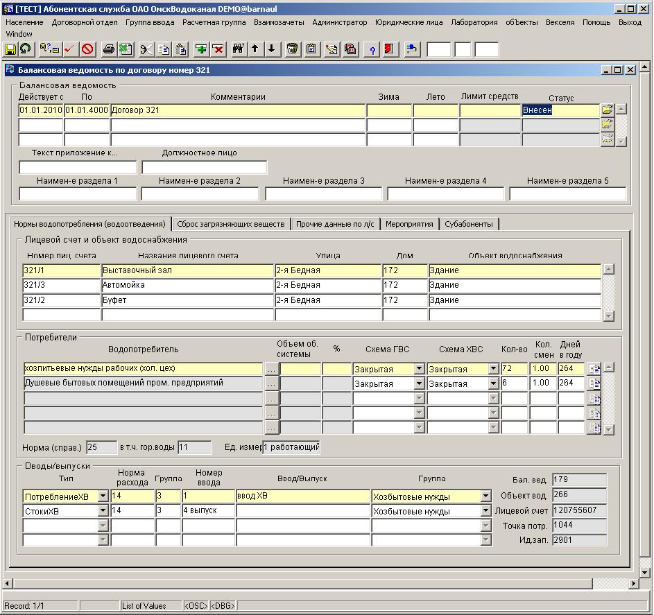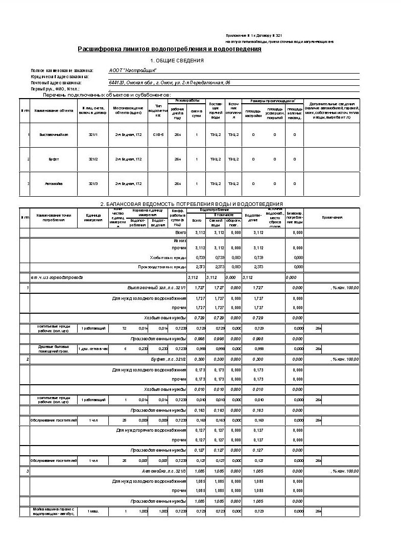 Глава 7. Балансовая ведомостьДля расчета необходимо создать балансовую ведомость. В этом документе для каждого лицевого счета создается потребитель (точка потребления), для которого указывается норма потребления, количество потребителей, количество смен, рабочих дней в году и т.д. Каждая точка потребления подключается к вводу и выпуску объекта водоснабжения. Для каждого лицевого счета можно указать временно согласованные концентрации вредных веществ, процент потерь на сетях, временно согласованные мероприятия (после выполнения которых в расчете будут участвовать другие лимиты и коэффициенты). Для бюджетных договоров существует возможность указать лимит денежных средств. Наличие лимита приводит к формированию двух частей балансовой ведомости. Первая - требуемый лимит, вторая - лимиты, рассчитанные исходя их размера лимита бюджета. В случае поставок воды из иных источников (кроме Водоканала) есть возможность рассчитывать только стоки. Если к одному вводу с установленным прибором учета подключено несколько абонентов, то существует возможность внесения процентов распределения объемов между абонентами. В случае переключаемой схемы горячего водоснабжения в балансовой ведомости рассчитываются лимиты отдельно на зиму и на лето. Текст балансовой ведомости автоматически формируется и хранится в системе. Текст балансовой ведомости можно открыть в программе электронной таблицы, просматривать, печатать, отправлять по электронной почте и т.д.