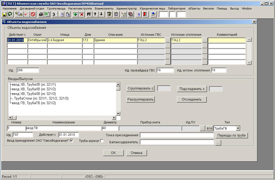Глава 3. Объект водоснабженияВ системе учитываются объекты водоснабжения. Объект водоснабжения привязан к адресу (к двум адресам для угловых домов), к источникам горячего водоснабжения и к источникам отопления. Для источника горячего водоснабжения и источника отопления учитывается история изменения во времени. Для объекта водоснабжения ведется учет системы вводов и выпусков. Возможен учет сложной иерархической структуры труб, которая отображает инфраструктуру объекта водоснабжения и подключение субабонентов. Как на ввод, так и на выпуск может быть установлен прибор учета. Возможны любые варианты подключения труб, например: