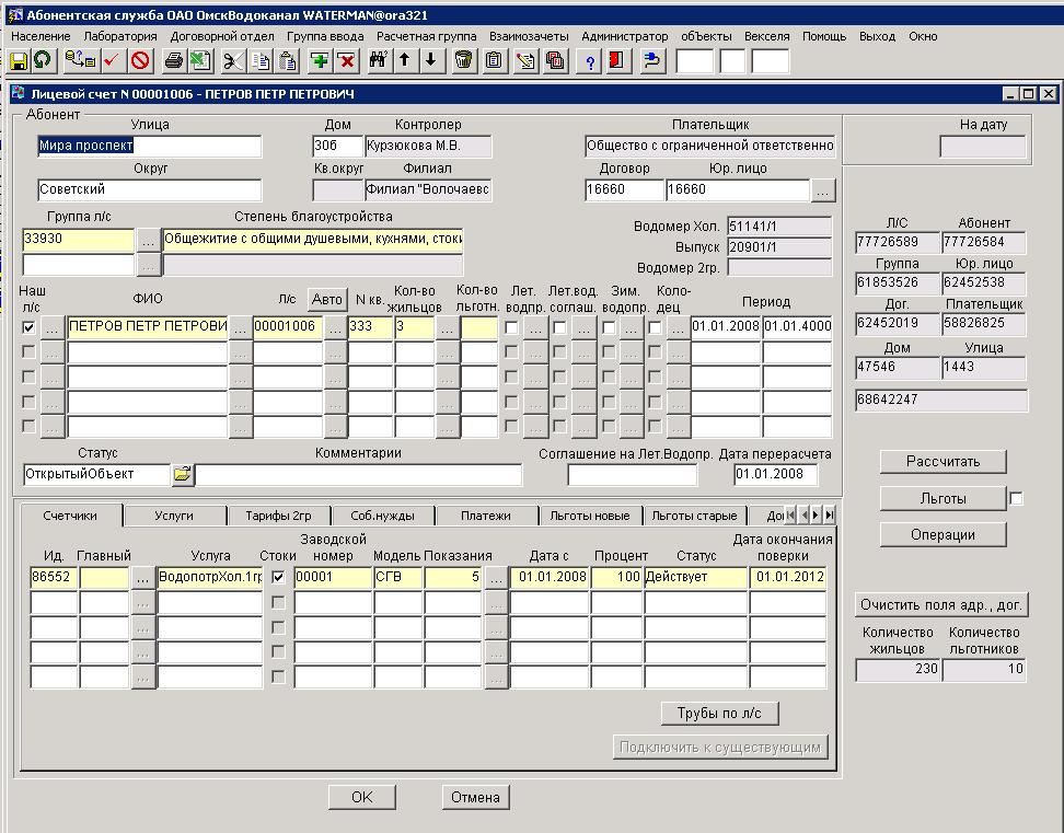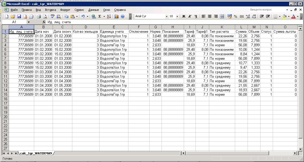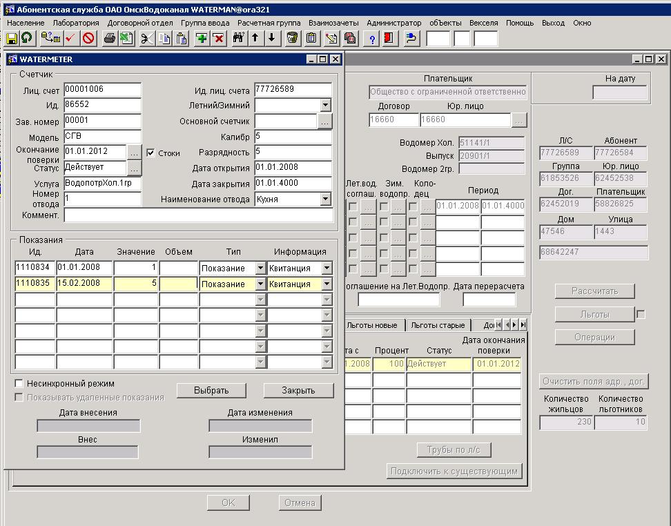 Перерасчет лицевого счетаВнесите еще одни показания по прибору учета. Для этого перейтите на вкладку Счетчики. Нажмите кнопку рядом с полем Показания, при этом откроется форма Счетчики, в которой введите следующее показание. При внесении показаний по приборам учета производится расчет среднедневного потребления воды, по которому ведутся начисления, с учетом процентного деления (если прибор учета зарегистрирован на нескольких лицевых счетах). Вернитесь в карточку лицевого счета. Если обновить информацию, то вы увидите, что установлена дата перерасчета, равная дате предыдущих показаний. Расчитайте лицевой счет и получите по нему отчет, в котором видно, за какие периоды услуги расчитаны по норме, по показаниям или по приборам учета. Если расчет прошел без ошибок, то в форме указываем период с 01/01/2008, нажимаем