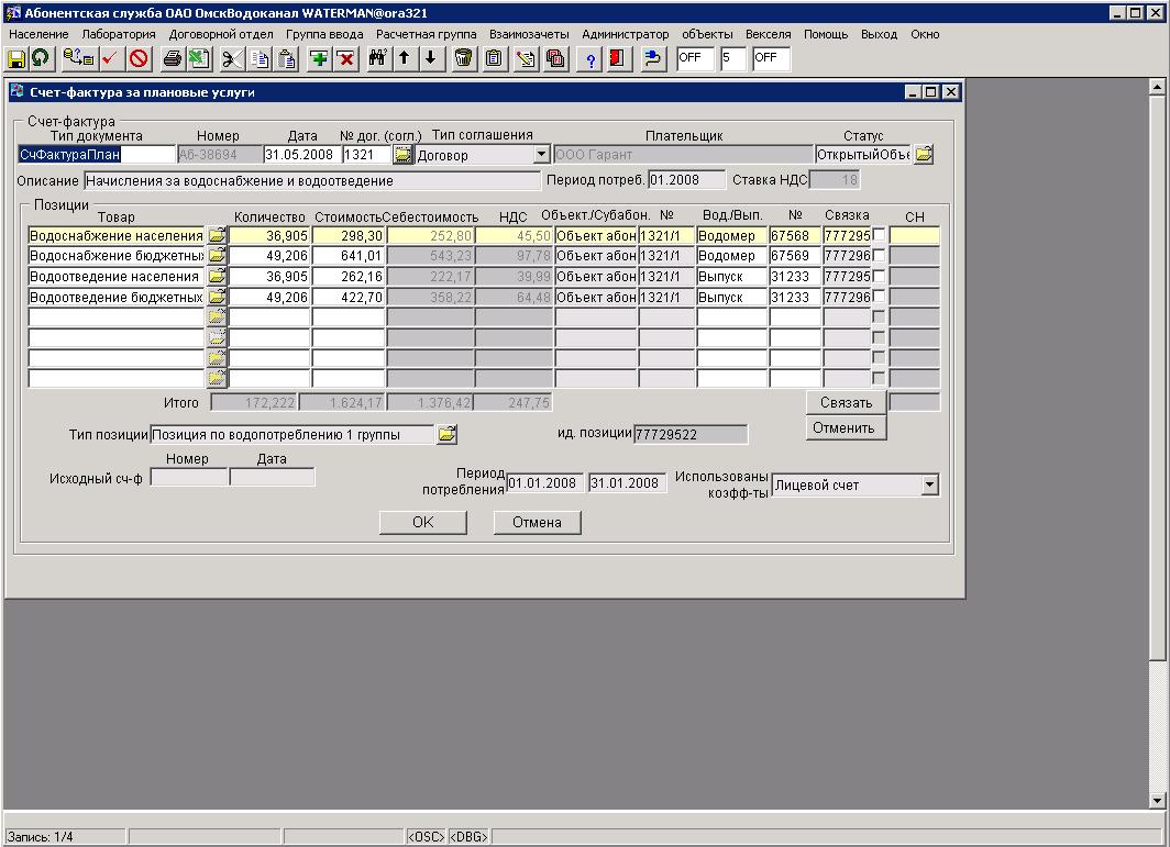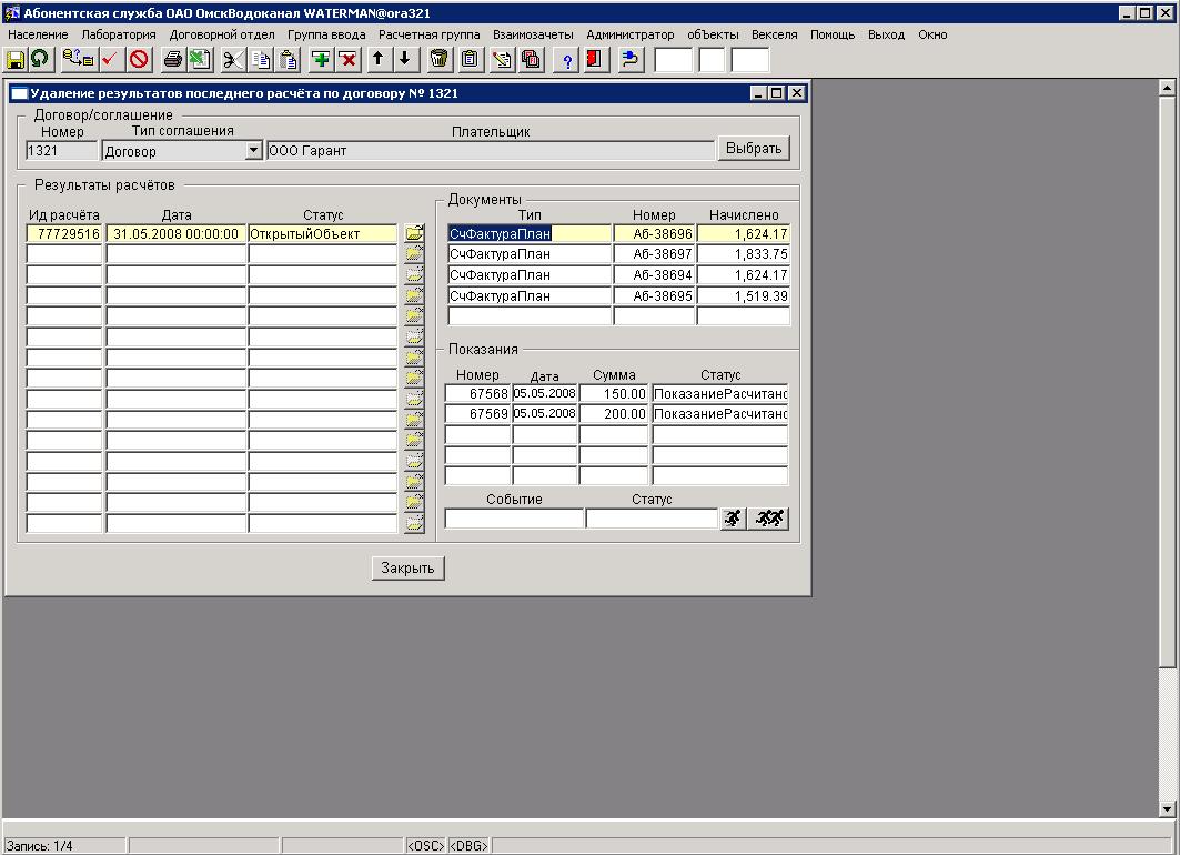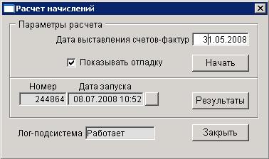 Расчет договораДля запуска расчета по договорам юридических лиц выберите меню Группа ввода - Расчет начислений. Откроется форма Расчет начислений, в которой укажите период расчета (31/05/2008). Нажмите кнопку Начать. Результат расчета можно будет увидеть в открывающейся форме. Если при расчете возникли ошибки, то в этой форме вы увидите записи со статусом ERROR с описанием типа возникшей ошибки (выделены красным цветом). Посмотреть номера и количество сформированных счетов-фактур по договору, а так же удалить расчет можно в форме Удаление результатов расчета меню Группа ввода - Удаление результатов расчета. Перейдите в режим запроса, введите номер созданного вами договора, выполните запрос. Вы увидите дату последнего запроса, номера и суммы созданных счетов-фактур. Для удаления расчета переведите расчет в статус УдаленныйОбъект. Сформированные счета-фактуры можно увидеть в форме Счет-фактура за плановые услуги меню Расчетная группа - Счета-фактуры - За плановые услуги.