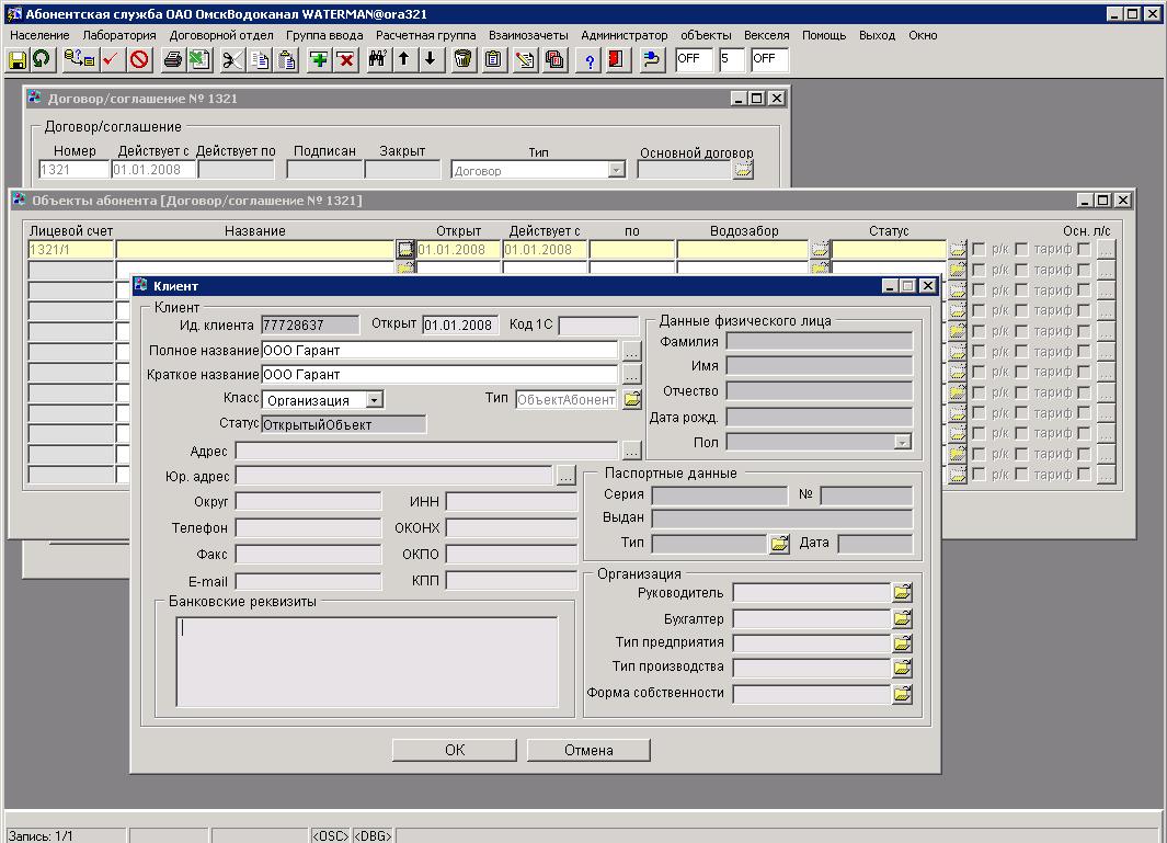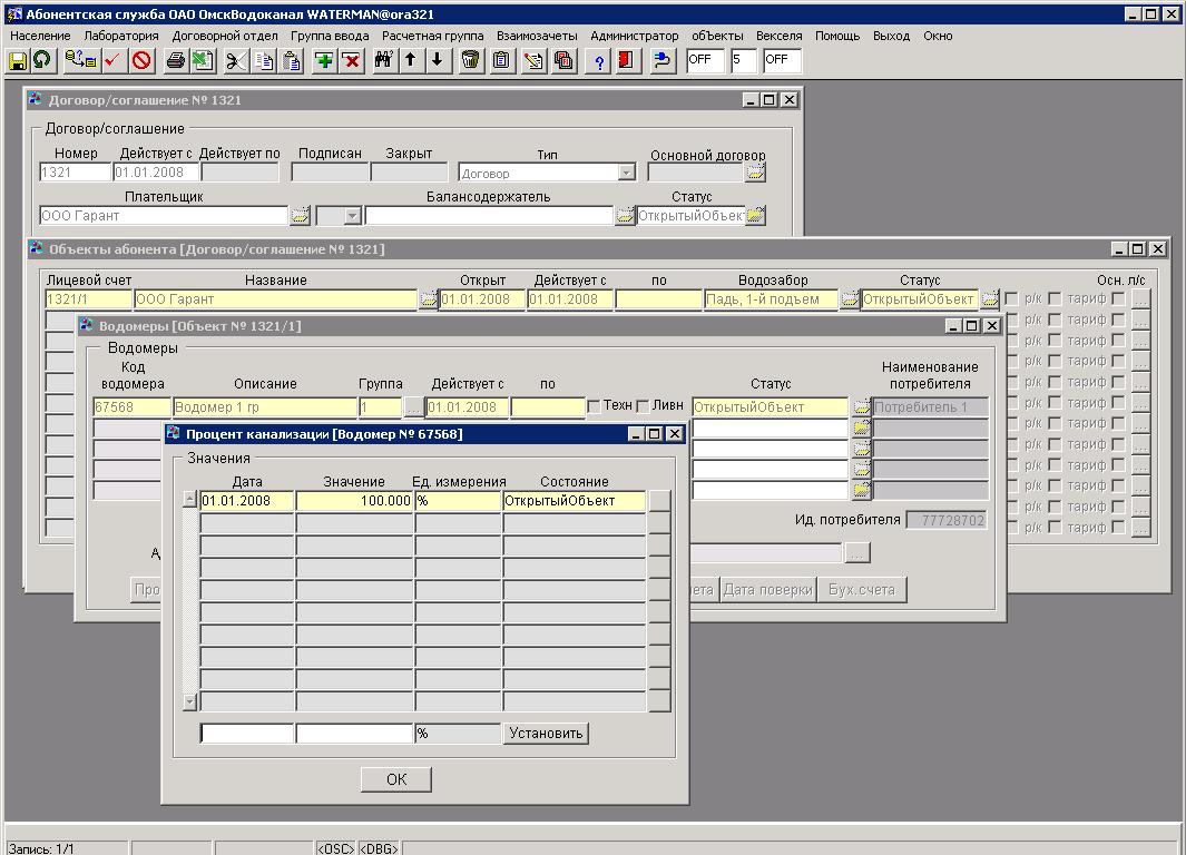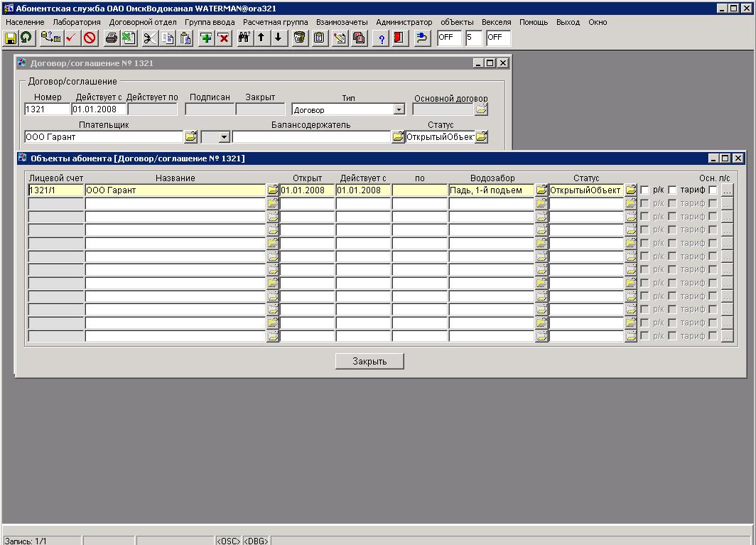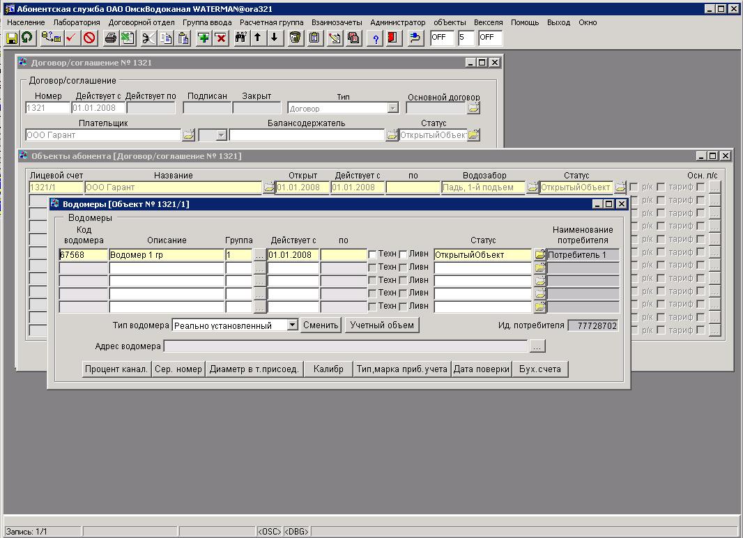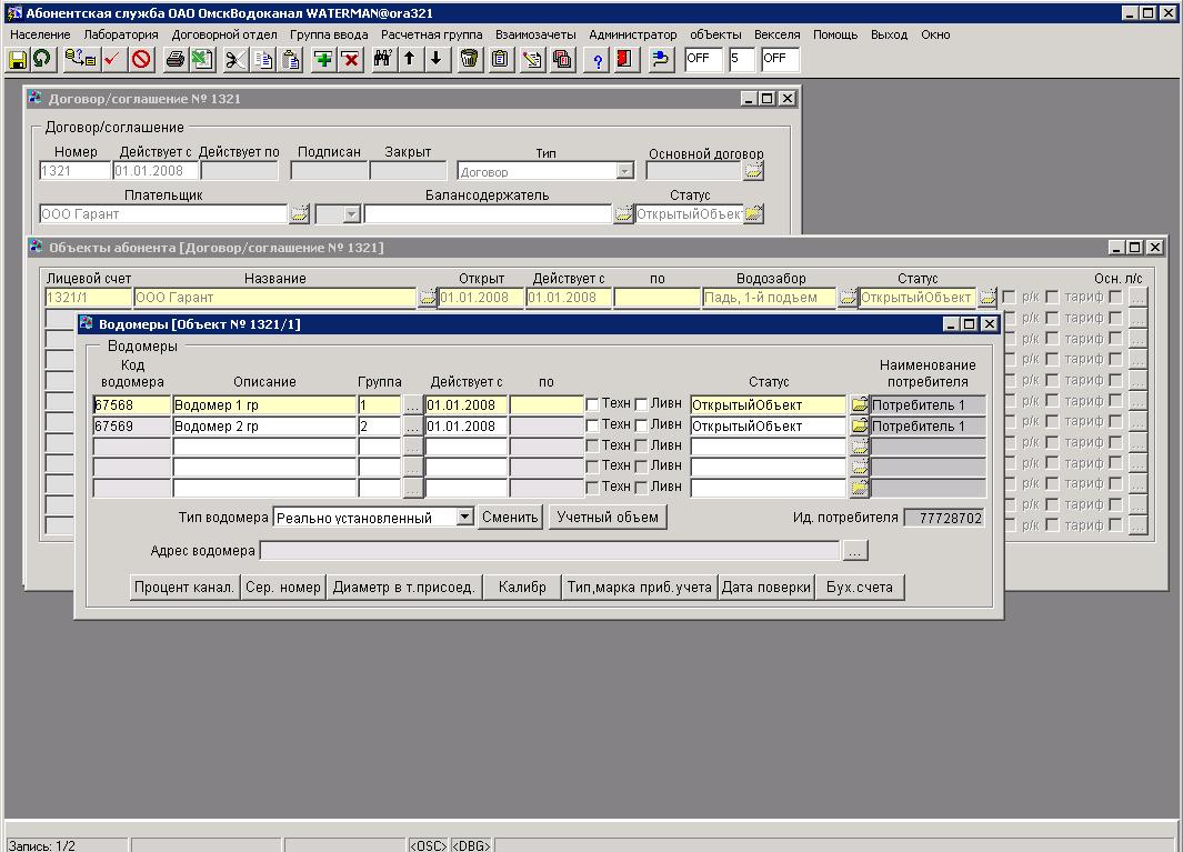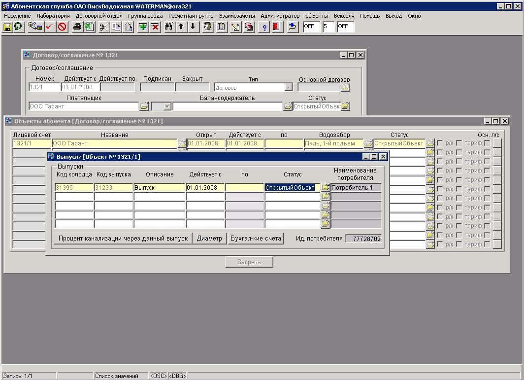 Создание Лицевого счета юридического лица.Для дальнейшей работы с договором необходимо создать лицевой счет юридического лица (объект абонента), для которого уже указываются водомеры, выпуски, лимиты и прочая информация, необходимая для расчета. Нажмите кнопку Объекты абонента, откроется форма Объекты абонента. Введите номер лицевого счет. Для того, чтобы создать абонента нажмите кнопку рядом с полем Название, откроется форма Клиенты, введите полное и краткое название потребителя, сохраните данные, нажмите кнопку ОК. Далее укажите дату открытия лицевого счета (01/01/2008), дату начала действия (01/01/2008), выберите из списка водозабор. Сохраните введенную информацию. Переведите созданный объект в статус ОткрытыйОбъект. Для расчета по данному лицевому счету необходимо создать водомеры. Для этого Нажмите на форме Объекты абонента правую кнопку мышки, при этом откроется контекстное меню, в котором выберите пункт Водомеры. Укажите название водомера (Водомер 1 гр.), группу потребления (1), дату начала действия водомера (01/01/2008). В поле Потребитель выберите из списка необходимого потребителя. При создании нового водомера можно выбрать значение Новый потребитель. Сохраните данные, переведите водомер в статус ОткрытыйОбъект. Далее у водомера необходимо изменить статус ОткрытйОбъект на ГотовКВводуПоказаний (из списка возможных статусов выберите ПодготовкаКВводу). Аналогично создайте водомер по 2 группе потребления. Переведите в статус ГотовКВводуПоказаний. Аналогично создайте водомер по 3 группе потребления (для начислений по поверхностным стокам). Переведите в статус ГотовКВводуПоказаний. Для каждого водомера укажите процент канализации. Для этого нажмите кнопку Процент канализации и в открывшейся форме укажите дату (01/01/2008) и процент (100). Далее создайте выпуск для данного объекта абонента. Нажмите на форме Объекты абонента правую кнопку мышки, при этом откроется контекстное меню, в котором выберите пункт Выпуски. Укажите название выпуска (Выпуск), дату начала действия выпуска (01/01/2008). Сохраните данные, переведите выпуск в статус ОткрытыйОбъект. Укажите процент канализации по выпуску. Для расчета договора необходимо указать контролера для данного объекта абонента (атрибут является обязательным). Нажмите на форме Объекты абонента правую кнопку мышки, при этом откроется контекстное меню, в котором выберите пункт Контролер. В нижней части формы в поле Контролер выберите из списка нужного контролера, укажите дату начала действия контролера (01/01/2008) по объекту, нажмите кнопку Добавить.